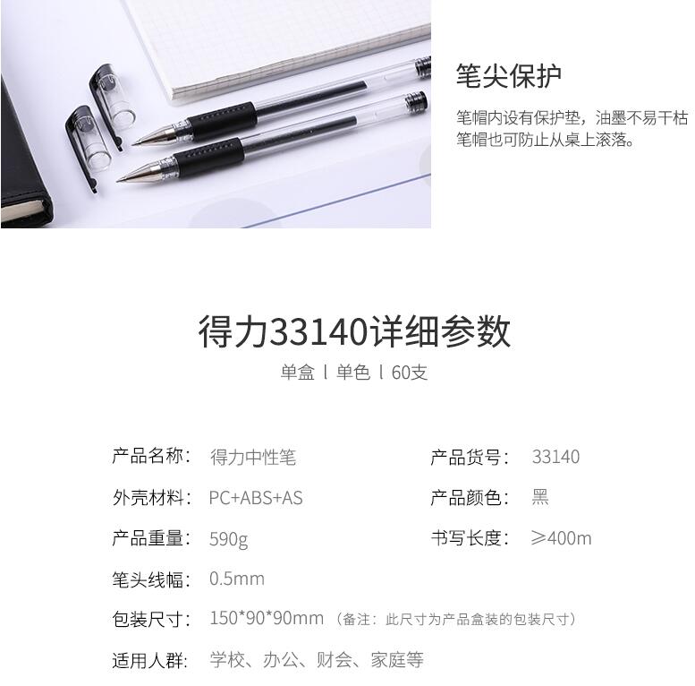 得力文具33140中性筆學(xué)生考試量販?zhǔn)胶诠P水筆碳素筆0.5mm辦公用品包郵書寫工具60支裝
